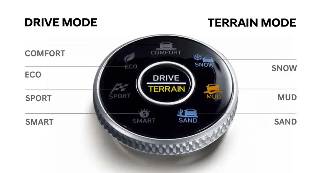 New PALISADE dilengkapi dengan empat mode penggerak (Comfort, Eco, Sport, Smart) dan tiga mode jenis medan sesuai dengan kondisi medan yang dapat dilalui. Pengemudi dapat memilih dari beragam mode berkendara berdasarkan preferensi pribadi maupun kondisi jalan.