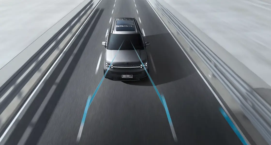 Kamera depan melacak penanda garis jalur dan membantu pengemudi untuk tetap menjaga kendaraan agar tetap aman di tengah jalur.