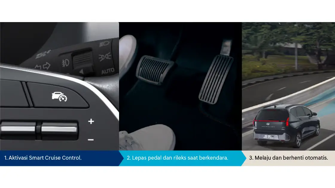 Mengatur kecepatan kendaraan tanpa harus menginjak pedal gas yang secara otomatis dapat menyesuaikan jarak kendaraan di depannya. Apabila kendaraan di depan berhenti, SCC akan secara otomatis mengurangi kecepatan sampai berhenti, dan akan kembali melaju mengikuti kendaraan di depan. Fitur sempurna untuk hadapi macet di jalanan Indonesia.